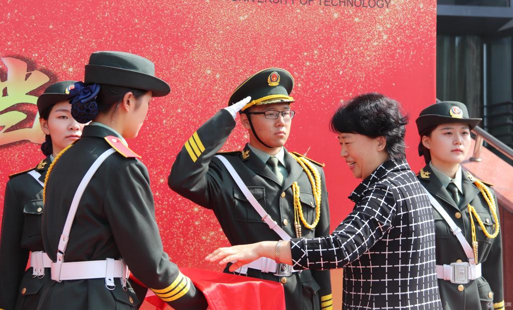 校党委副书记田红芳为新一届国旗班队员佩戴臂章。新队员在国旗下庄严宣誓,铮铮誓言展示出了我校青年学生以忠诚和担当捍卫国旗尊严,以爱国和奉献挥洒青春热血的坚定信念。