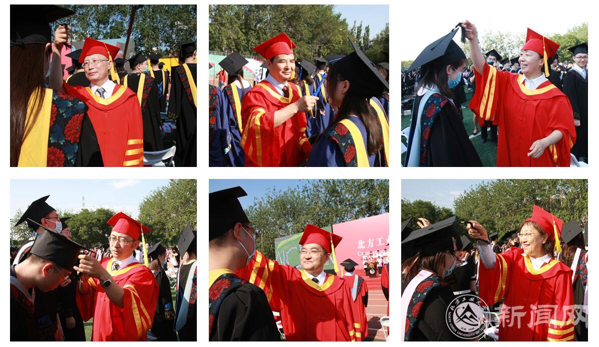 校领导、学院领导及学位委员会委员走到毕业生中间,为毕业生们一一拨正流苏。
