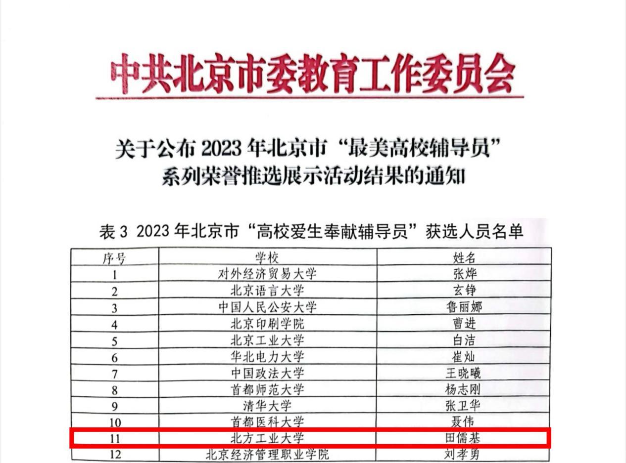近日,北京市委教育工委公布北京市“最美高校辅导员”系列荣誉推选结果和“新时代北京高校思想政治工作创新示范项目”遴选名单。我校电气与控制工程学院辅导员田儒基获评2023年北京市“高校爱生奉献辅导员”荣誉称号,“绣花”思政工作室入选“北京高校思政工作创新示范工作室”,《“纽扣课堂”打造宿舍思政育人新模式》《融合式心理干预助学生化“无望”为“希望”》案例入选“北京高校思政工作创新示范案例”。