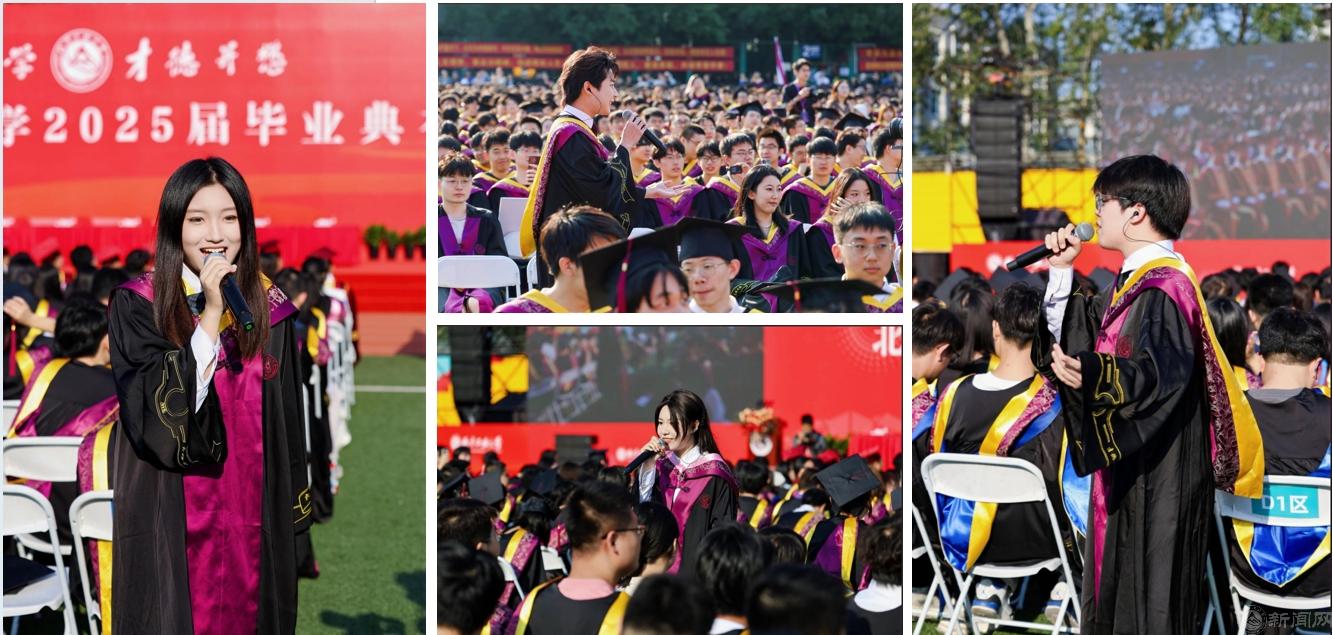 西操场上绿草如茵,人头攒动,操场上“此一程山高路远,下一程星河灿烂”“中西合璧少年郎,世界潮头我领航”等毕业寄语,是母校的嘱托,更是老师临别殷殷的期望。毕业生代表走上舞台,倾情献唱《起风了》《是龙》《星辰大海》《我的未来式》《new youth》等歌曲,唱出青春最亮丽的底色,唱响矢志报国、争当样板的壮志豪情。时光相册带领师生穿越时空,回顾四年大学生活点滴。